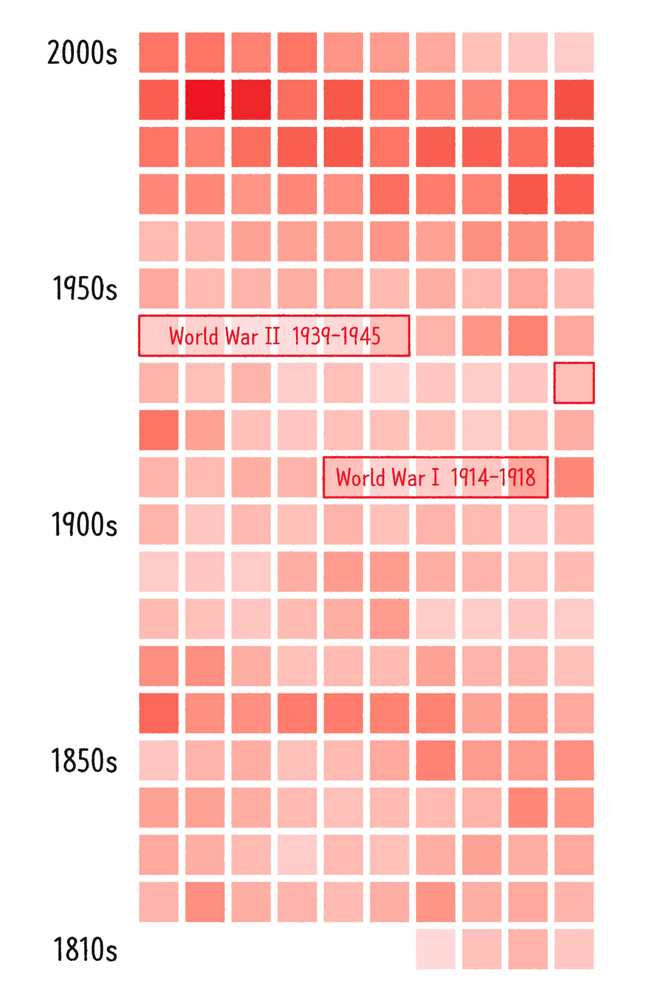 COW의 자료를 바탕으로 전쟁 시점을 정리해서 전쟁이 없었던 해가 있는지 시각화를 해봤습니다. 1816년부터 2009년까지 전쟁이 없었던 시점은 단 한 해도 없었어요. 모든 연도가 빈 틈 없이 꽉 차있죠? 200년 가까운 시간 동안 지구 상에는 매년 매년 어떤 전쟁이라도 있었던 겁니다. 게다가 최근으로 올수록 더 평화로울 거라는 기대와는 다르게 오히려 최근으로 올수록 전쟁의 빈도는 늘어나는 모습을 확인할 수 있어요. 가장 빈도가 적었던, 즉 한 해에 딱 하나의 전쟁이 있었던 연도는 2개가 있었는데 이 때는 바로 전 세계가 모두 2차 세계대전이라는 혼돈에 휩싸였던 1942년과 1943년이었죠.