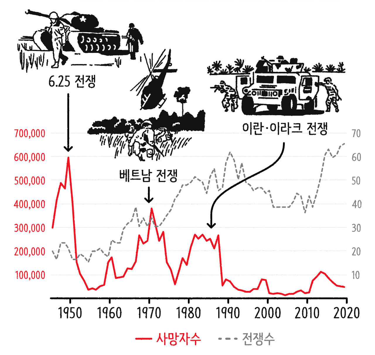 전쟁은 오히려 과거보다 늘었지만 전쟁으로 인한 사망자의 숫자는 감소하고 있습니다. 좀 이상한 일이죠? 그 이유는 전쟁 분류를 세부적으로 뜯어보면 알 수 있습니다. 전 세계 전쟁이 늘어난 건 맞지만 증가한 대부분은 내전이었거든요. 국가와 국가 간의 큰 규모의 전쟁은 거의 사라졌어요. 큰 규모의 전쟁이 과거에 비해 줄어들다 보니 전쟁으로 인한 사망자의 숫자도 감소한 거죠.