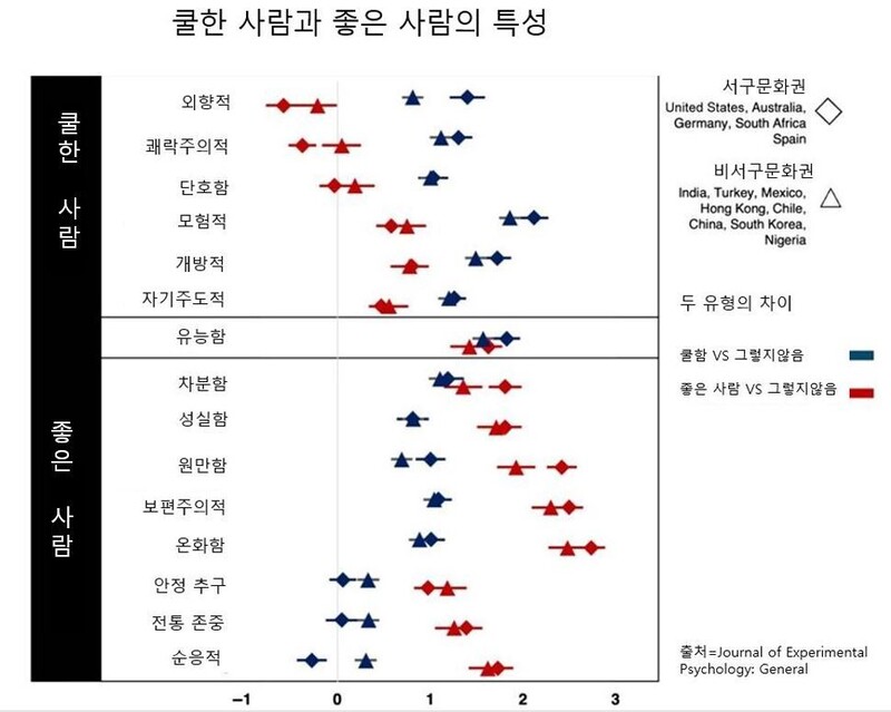 반면 ‘좋은’ 사람들은 그렇지 않은 사람에 비해 전통을 존중하고 순응적이고 안정을 추구하며, 온화하고 원만하고(agreeable) 보편주의적 가치를 지향하고, 성실하고 차분하다는 점이 특성으로 꼽혔다. 또 쿨한 사람과 좋은 사람은 모두 그렇지 않은 사람보다 유능(capable)하다는 평가를 받았다.