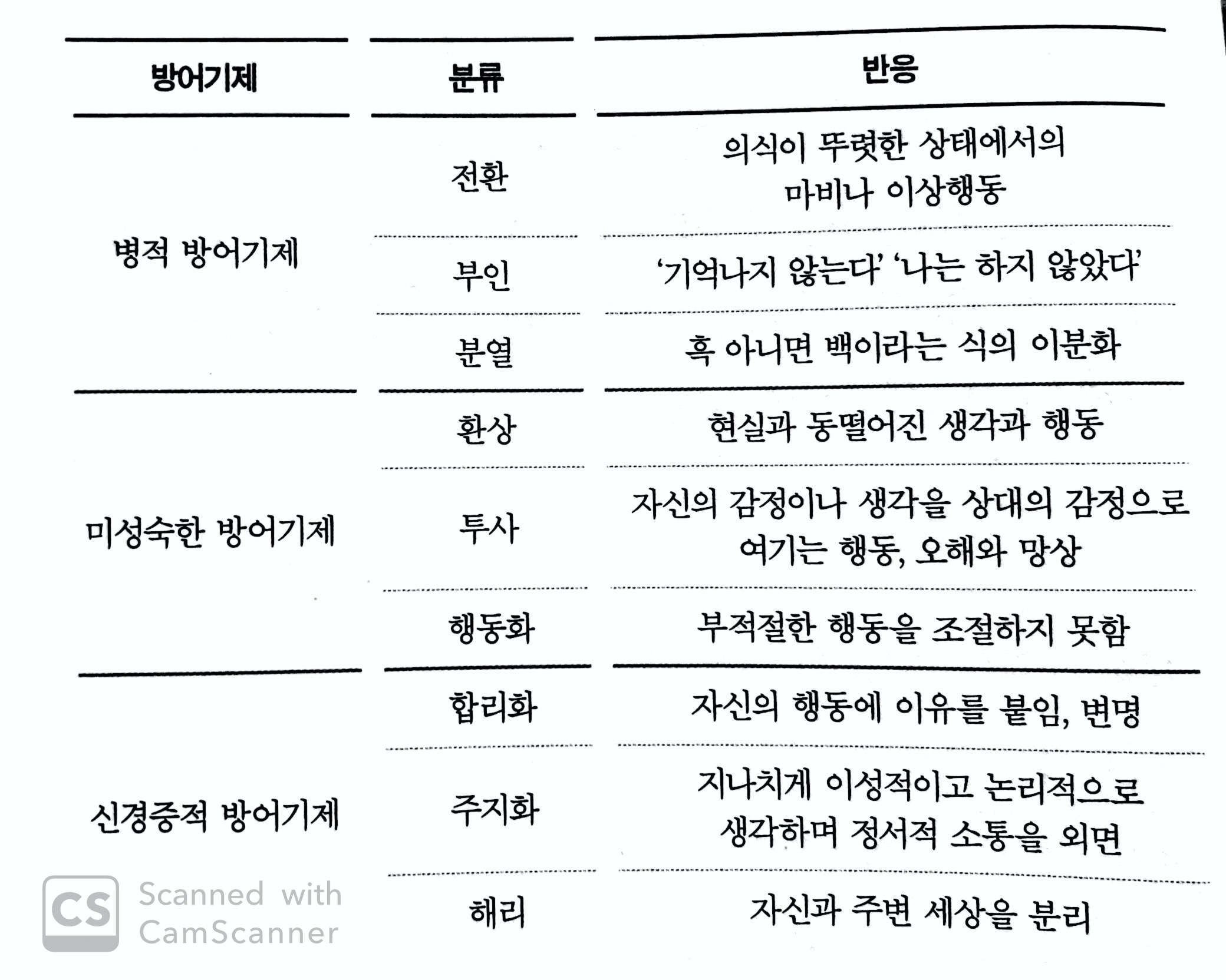 p.61 방어기제를 사용하는 수준이 그 사람의 인격적 성숙도를 반영할 수 있다. 조지 베일런트 교수는 인격의 성숙 정도에 따라 방어기제를 네 가지 수준으로 나누었다. 병적 방어기제 / 미성숙한 방어기제 / 신경증적 방엉기제 / 성숙한 방어기제이다.