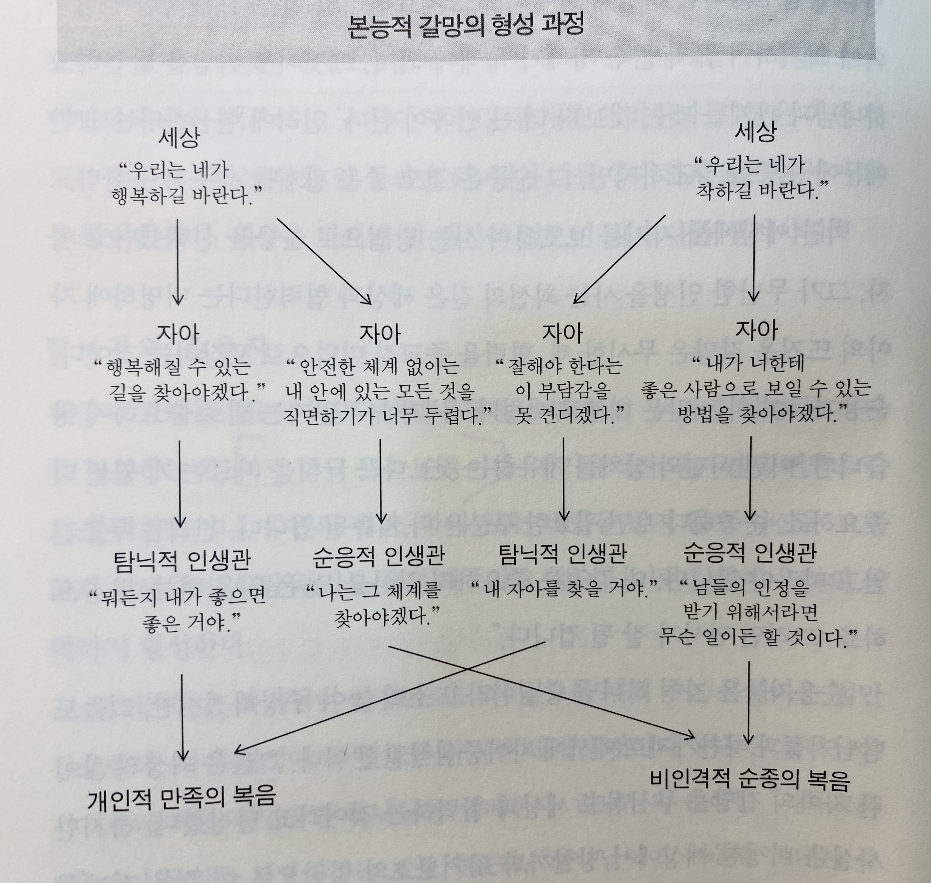 p.54 세상과 관계를 맺는 이런 다양한 유형은 우리 안에 두가지 갈망 중 하나를 형성하는데 바로 탐닉 또는 순응이다.