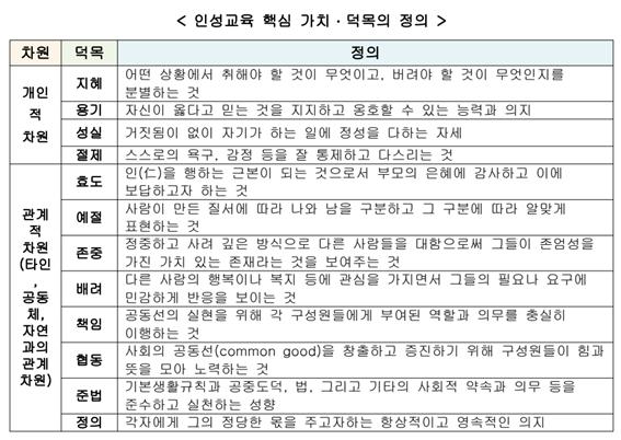 교육청에서 이야기하는 인성교육의 가치와 덕목도 있다.