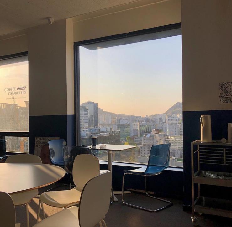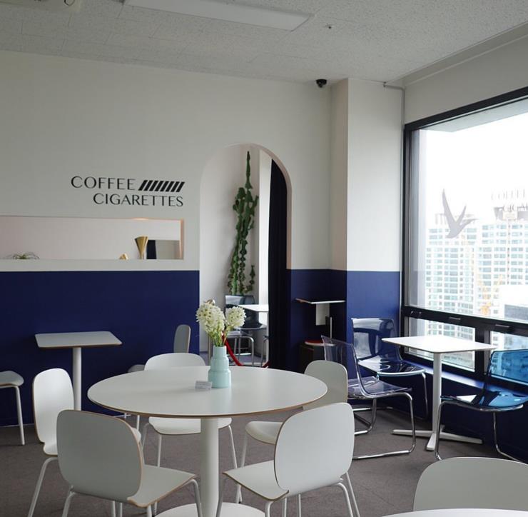 커피 앤 시가렛은 지하철 시청역 부근 유원빌딩의 꼭대기, 17층에 있다. 사무실이 즐비한 건물 안에 서울의 풍경을 한 눈에 내려다 볼 수 있는 카페가 있다는 사실만으로도 재미있다. 커피 앤 시가렛은 ‘건강한 사회 구성원이 건강한 세상을 만든다’는 생각을 갖고 일하는 프로젝트 브랜드 인스턴트 베케이션 클럽이 만든 공간이다. 커피 앤 시가렛은 도시인에게 짧고 즉각적인 휴가같은 시간을 선물하고자 하는 브랜드의 지향점이 담겨있는 카페이다. 아침 7시반부터 문을 열어서 일찍 출근하는 사람들이 즐겨 찾고 점심에는 뷰를 보기 위한 사람들로 문전성시를 이룰 만큼 주변 직장인들 사이에서 입소문이 자자하다. 햇살이 가득 들어오는 낮에 가서 지인들과 담소를 나누고 또 가만히 서울 풍경을 감상하는 것도 좋지만 커피 앤 시가렛의 진가는 해질 무렵부터 드러난다. 서울 빌딩숲 뒤로 해가 뉘엿뉘엿 넘어가며 노을을 만드는 시간, 주홍빛이 카페 안으로 가득 들어오는 때가 가장 아름답기 때문이다. 그 풍경 속에서 커피 한 잔 하는 기분이란. 시그니처 비엔나, 솔트 스카치 라떼 등 커피 메뉴들이 괜찮고 르 꼬르동 블루 출신의 파티시에가 만드는 구움 과자도 좋다. 카운터 바로 옆에는 담배와 커피 앤 시가렛의 로고가 새겨진 라이터도 진열돼 있고 구매도 가능하다. 물론 카페 안에서는 금연이다. 주소 서울 중구 서소문로 116