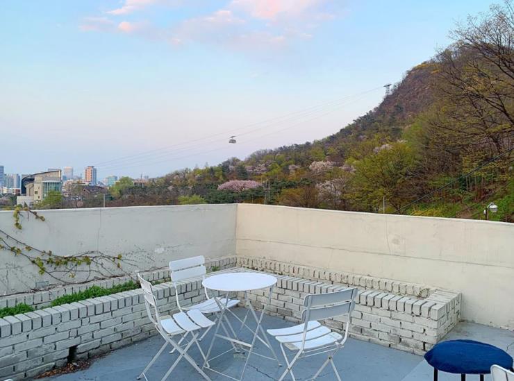 남산 오르는 길 중턱, 연두빛 덩굴 식물 아이비가 감싸서 인상적인 하얀 벽돌 건물이 있는데 바로 카페 마뫼다. 안으로 들어서면, 하얀 테이블과 의자가 놓여 있고 창문 너머로 남산이 보인다. 이곳의 매력은 남산을 그대로 느낄 수 있는 테라스인데 시시각각 변하는 남산의 모습을 여유롭게 바라볼 수 있다. 이른 봄 남산의 개나리와 진달래가 어여쁘고, 벚꽃이 만개하는 시기엔 황홀하기까지 하다. 5, 6월 이맘때의 남산은 다채로운 초록빛이 가득해 싱그러울 것이다. 오전 11시부터 저녁 10시까지 넉넉히 문을 열어서 남산의 야경을 즐기기에 또 이만한 스폿이 없다. 주소 서울 중구 소파로 41