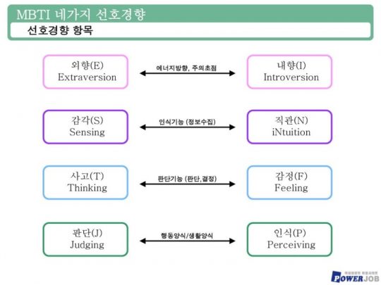 - J 판단형: 어떤 일을 계획하고 수행할 때 큰 그림에 대한 계획을 미리 세우고 조직적, 체계적으로 진행하기를 좋아하는 성향입니다. 임기응변식이 아니라 미래에 대한 구체적인 방향, 변수에 대한 통제 등을 확실히 해놓는 것을 좋아합니다.