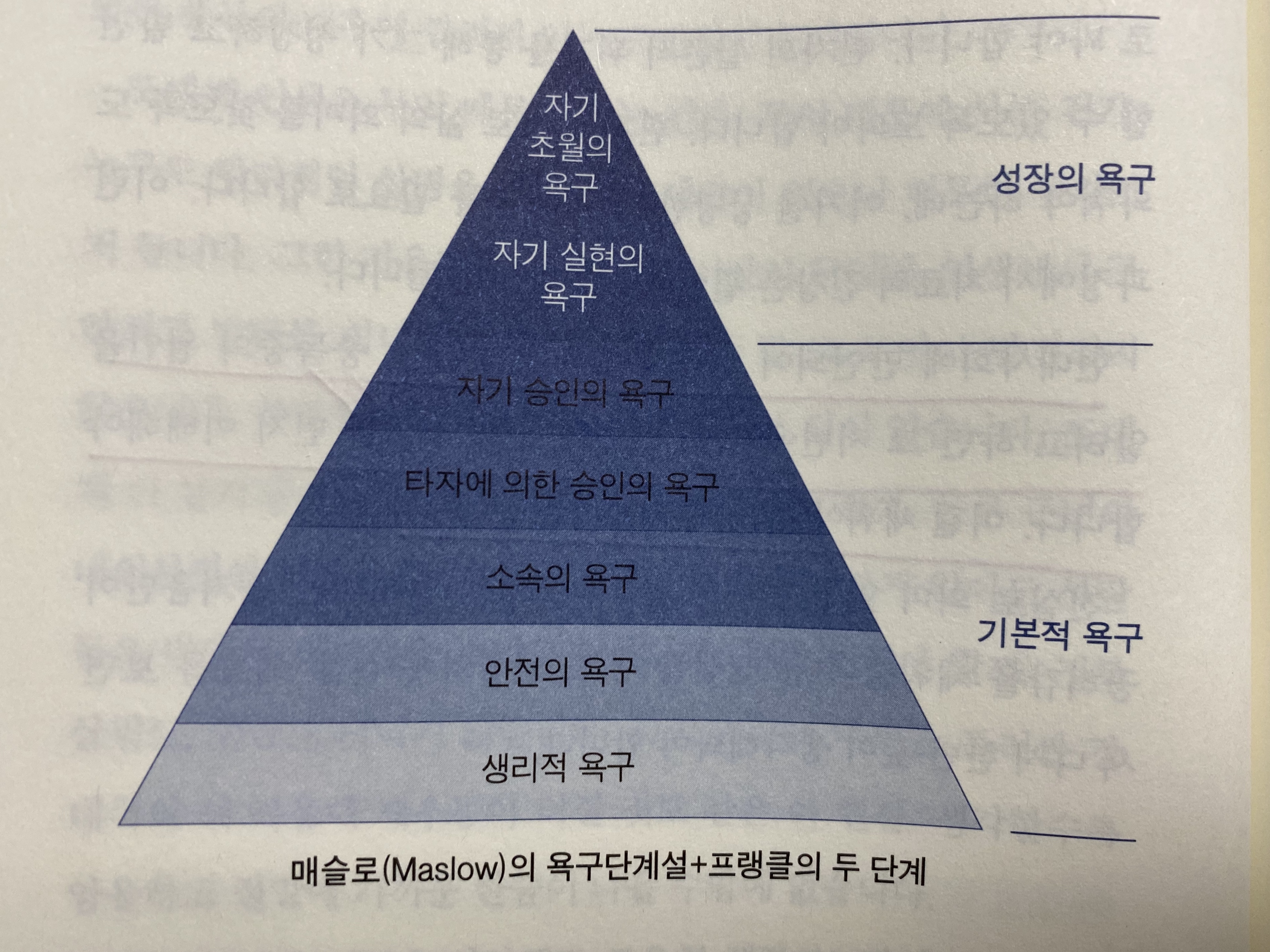 p.95 매슬로의 욕구단계설은 다섯 단계로 되어 있지만 프랭클은 두 단계로 더 만들었습니다 .자기 실현의 욕구, 자기 초월의 욕구가 들어가 있다.