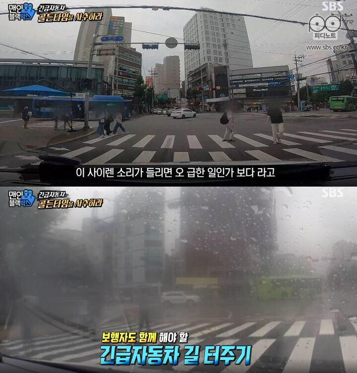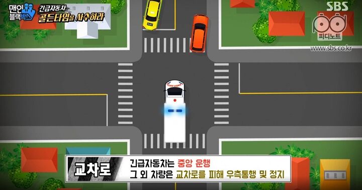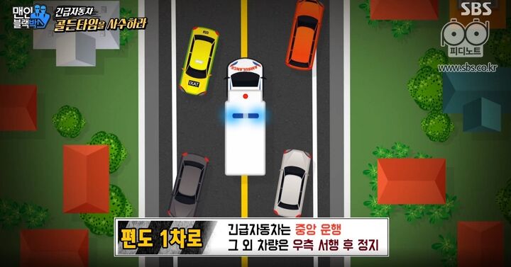 긴급차량이 중앙 운행할 수 있도록 그 외 차량은 교차로를 피해