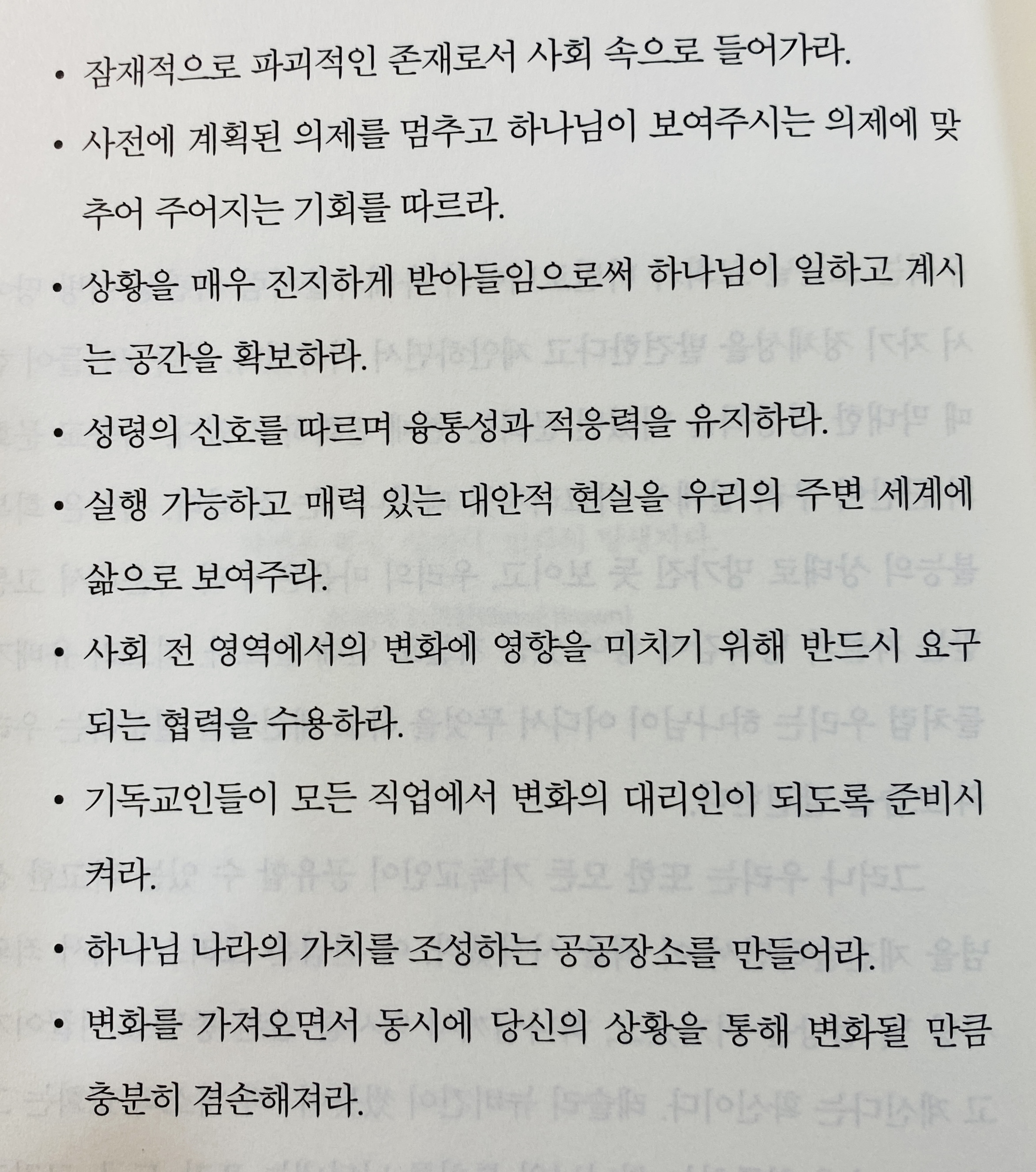 p.305 교제, 공동체, 상황 이라는 틀 안에서 우리 모두는 예수를 따르면서 선교적 육성을 위한 여섯가지 자세를 좇아 행하는 법과, 우리의 헌신과 집단적 소명을 신실하게 살아내는 법을 배울 수 있다.