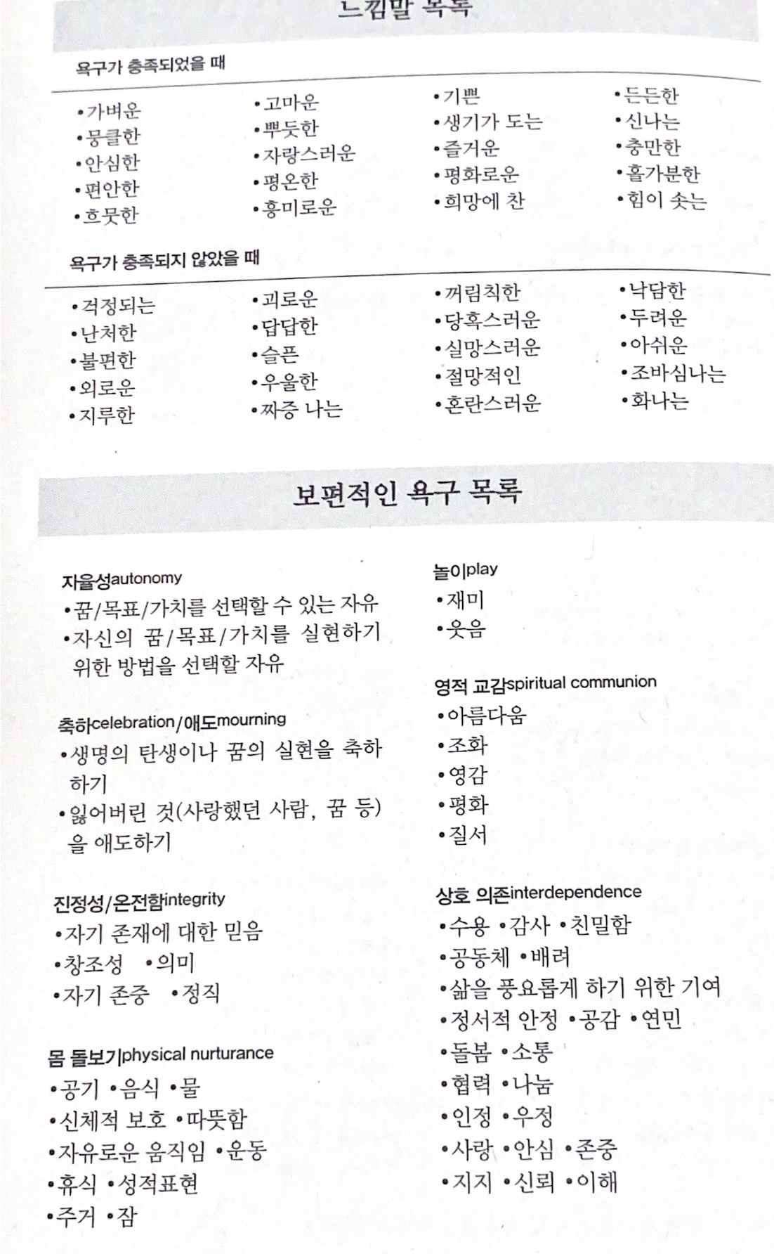- 다른 사람이 어떤 말을 하든 우리는 이들이 무엇을 관찰하고, 느끼고, 필요로 하고, 부탁하는가에만 귀를 기울인다.