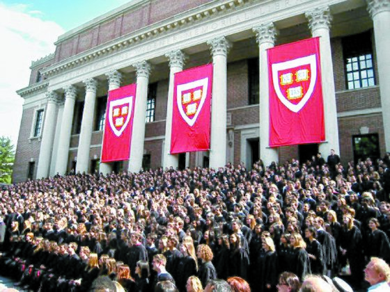 하버드대 학생들이 졸업식에 참석하고 있다. 학생들 사이에선 "하버드 졸업 후에는 인생이 쉬워진다"는 말이 돌 만큼 공부의 양과 강도가 아주 높다. [중앙포토]