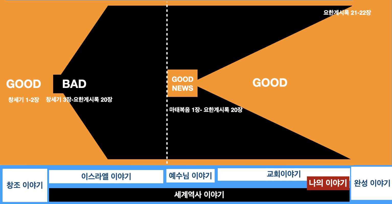 성경 전체 이야기를 이해할 때 먼저 '7가지 이야기'로 성경을 바라보자. 성경은 7가지 이야기로 되어 있는데 창조이야기, 이스라엘 이야기, 예수님 이야기, 교회 이야기, 그리고 창조이야기 이후로 같이 진행되는 세계역사 이야기가 있고, 그 가운데 나의 이야기가 있으며, 마지막에 그 모든 것이 하나가 되고 마무리되는 완성이야기가 있다.