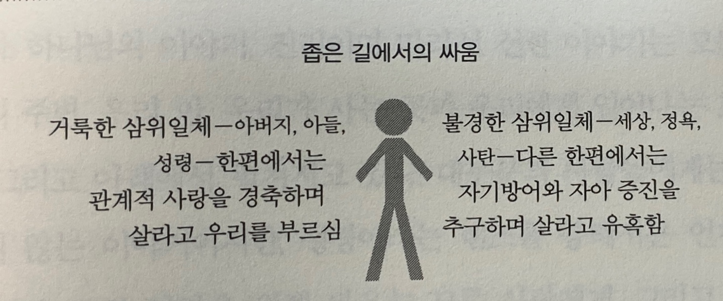 p105 좁은 길은 정확히 두 이야기 간의 싸움, 즉 우리 뜻과 하나님 뜻 간의 싸움으로 우리를 데려간다. 두 이야기의 줄거리는 관계적이다. 둘 다 사랑 이야기다.