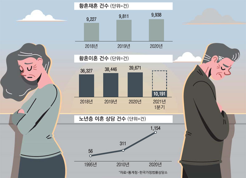 통계청 인구동향 자료에 따르면 올해 1분기 이혼 건수는 2만5206건으로 전년 동기(2만4358건) 대비 3.5% 증가했다. 특히 혼인 지속기간이 20년 이상 된 부부의 황혼이혼 건수는 올해 1분기 1만191건으로 전년 동기(8719건) 대비 무려 16.9% 늘었다. 올해 이러한 증가 추세가 지속된다면 2019년(3만8446건)과 2020년(3만9671건) 황혼이혼 건수를 크게 웃돌 것으로 예상된다. 1분기 황혼이혼 수치는 4년 이하 신혼부부 이혼 건수(4492건)보다 2배 이상 높았다.