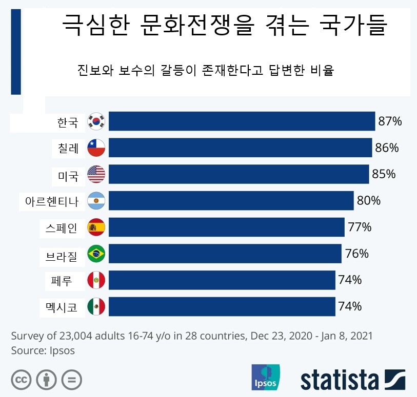 국제 여론조사업체 입소스와 영국 킹스칼리지런던 정책연구소가 전 세계 28개국 성인 2만3천여명을 대상으로 벌인 설문 결과에 따르면, 전체 12개 갈등 항목 중 진보-보수 갈등을 포함해 전체의 절반이 넘는 7개 항목에서 한국인들이 느끼는 문화전쟁 강도가 세계 최고 수준을 기록했다.