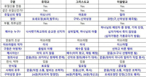 - 유대교는 율법에 의한 구원, 기독교는 믿음에 의한 구원, 이슬람교는 행위에 의한 구원