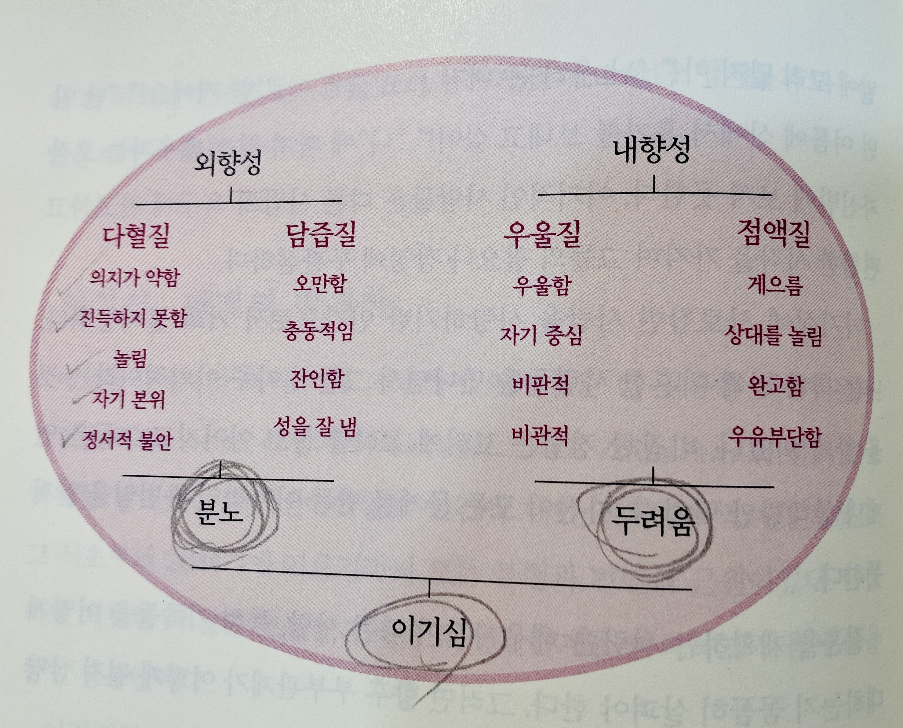 150 기질에 대해 연구하면서 외향적인 다혈질과 담즙질은 분노하기 쉽고, 우울지로가 점액질은 두려움에 빠지기 쉽다는 걸 알게 되었다... 외향형이 터뜨리는 분노는 두려움을 낳고, 내향형 기질의 두려움은 분노와 적의를 낳는다고 할 수 있다.