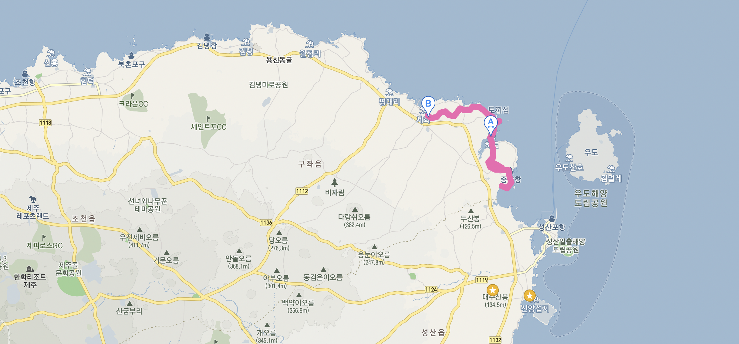 왼편에는 우도가 보이고, 오른편에는 성산봉이 보인다.