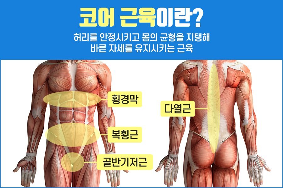 우리의 몸은 대체로 뼈대들이 그 틀을 잡아주고 보호하고 있어 비교적 튼튼하고 변화나 충격에 강하지만 복부 쪽은 뼈대가 없이 근육과 장기들로만 이루어져 있기 때문에 충격에 취약합니다. 이러한 충격과 변화들을 완충해 줄 수 있는 근육이 코어머슬이며 이때문에 코어머슬을 강하게 유지 해야합니다. 코어가 약하게 되면 충격흡수가 어려워 척추나 기타 부분에 큰 무리를 주어 각종 질병에 노출될 수 있습니다.