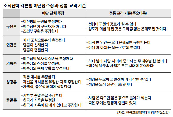 협의회는 이 같은 내용을 신론 인간론 기독론 구원론 교회론 종말론 등으로 나눠 정리했다(표 참조).